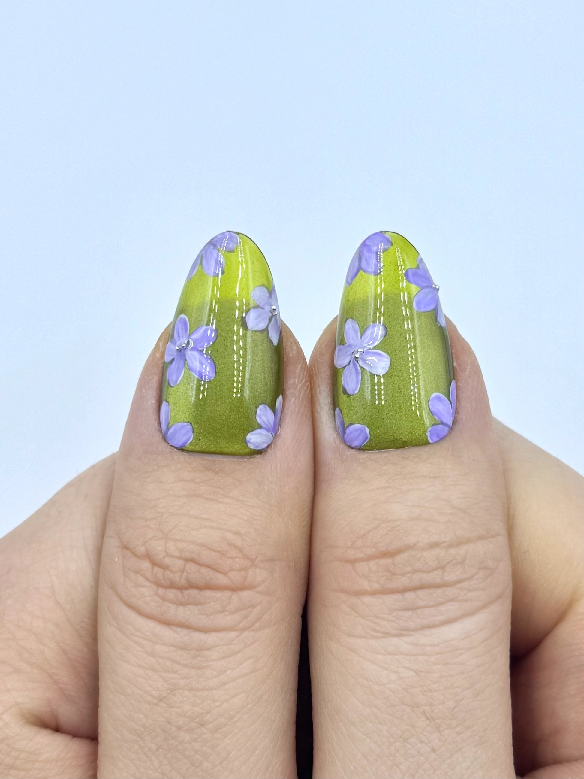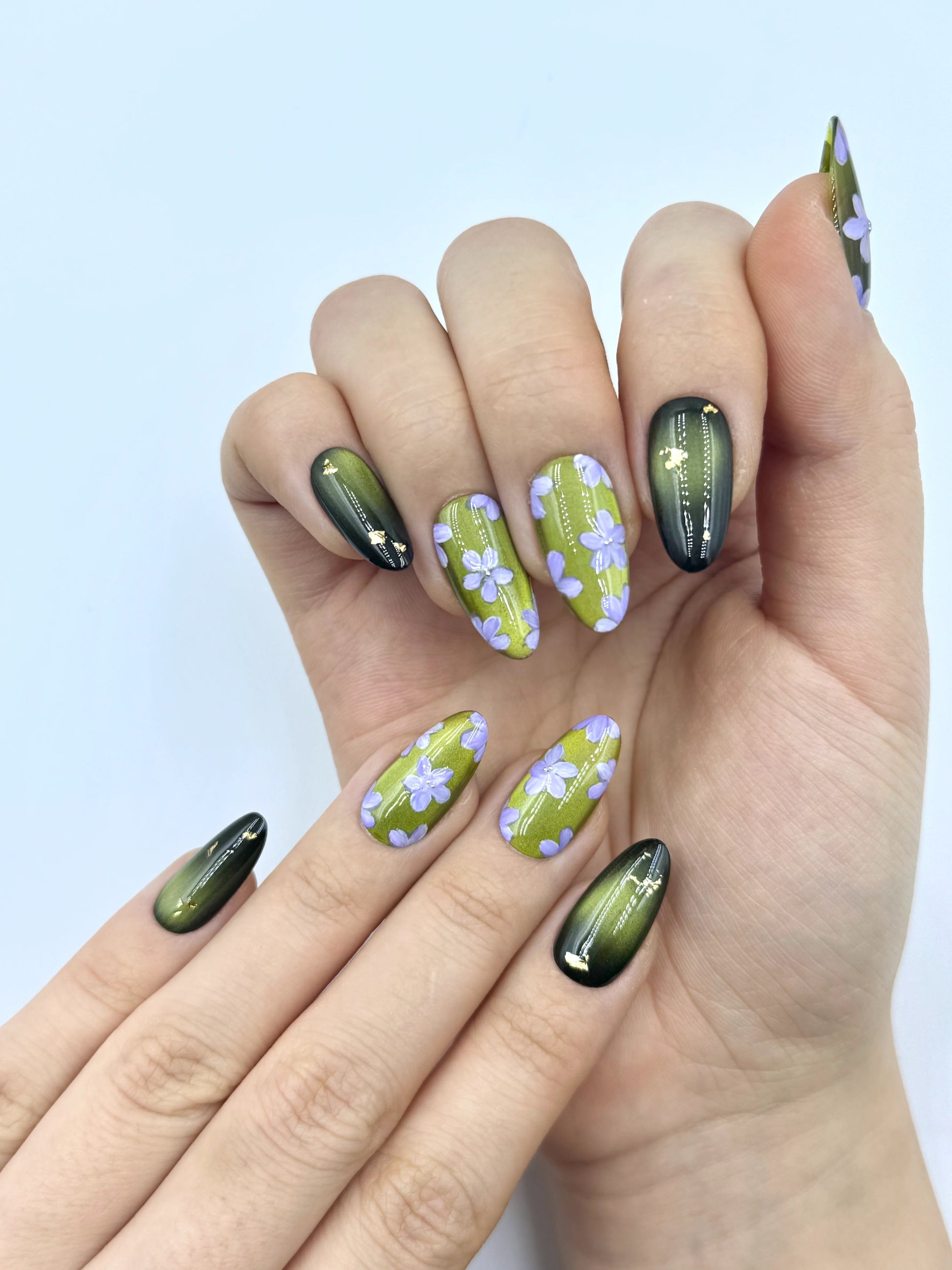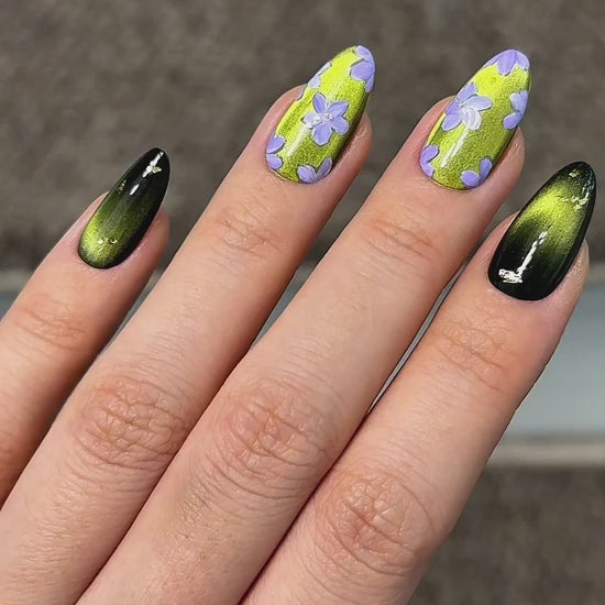 Earthy and quietly enchanting, Forest Trail features a luminous moss green cat-eye base that shifts gently with the light, like sunlight filtering through tall forest trees. Delicate handpainted lilac blossoms bloom softly across the surface, adding a subtle touch of woodland charm.