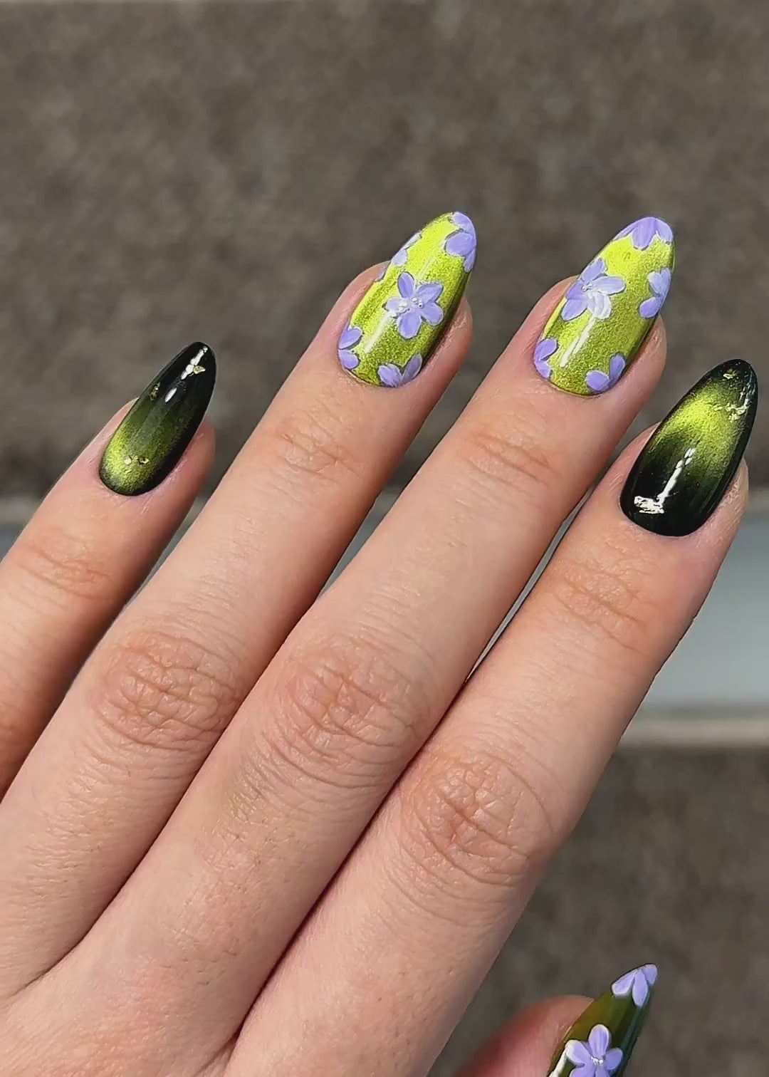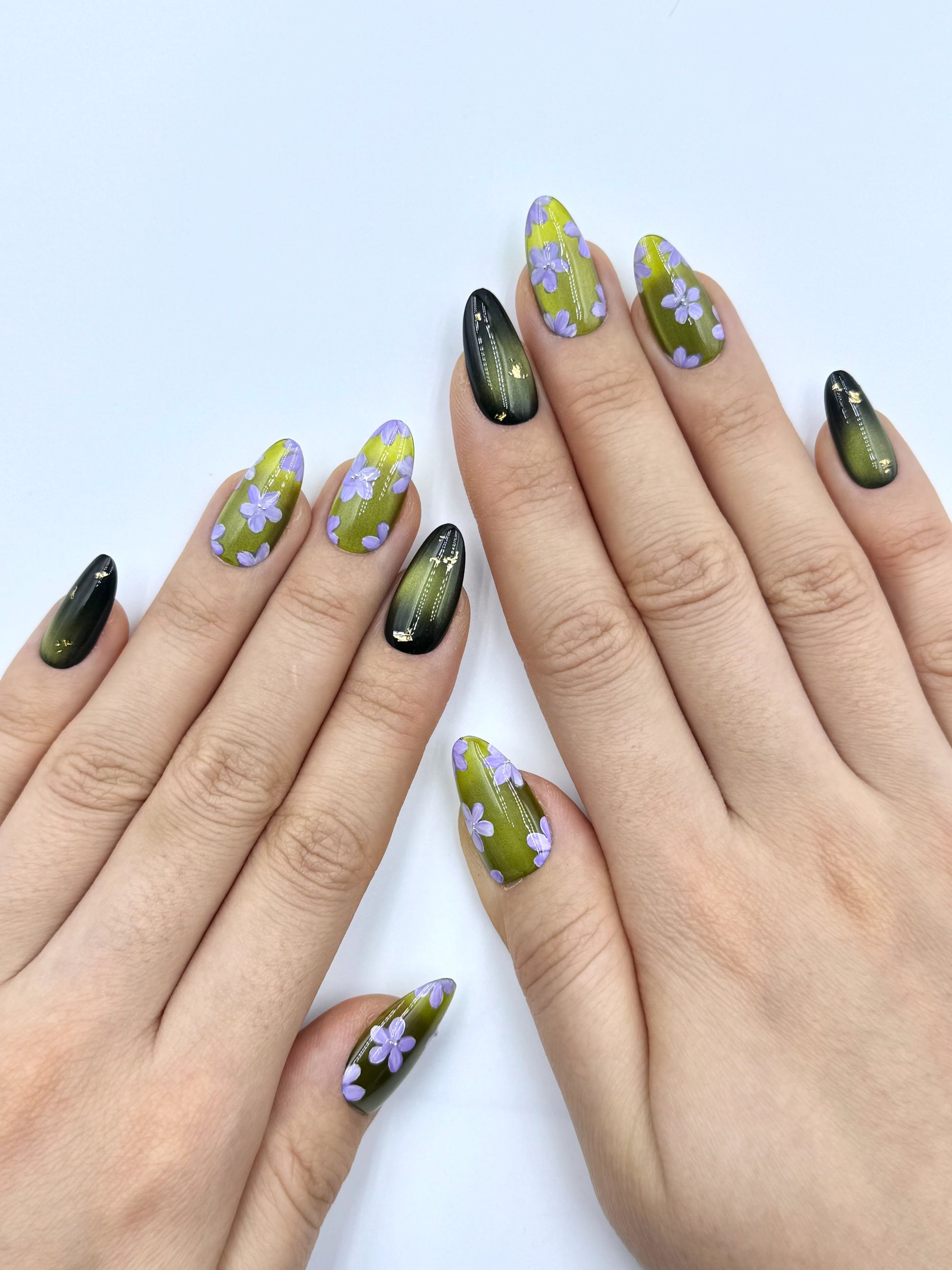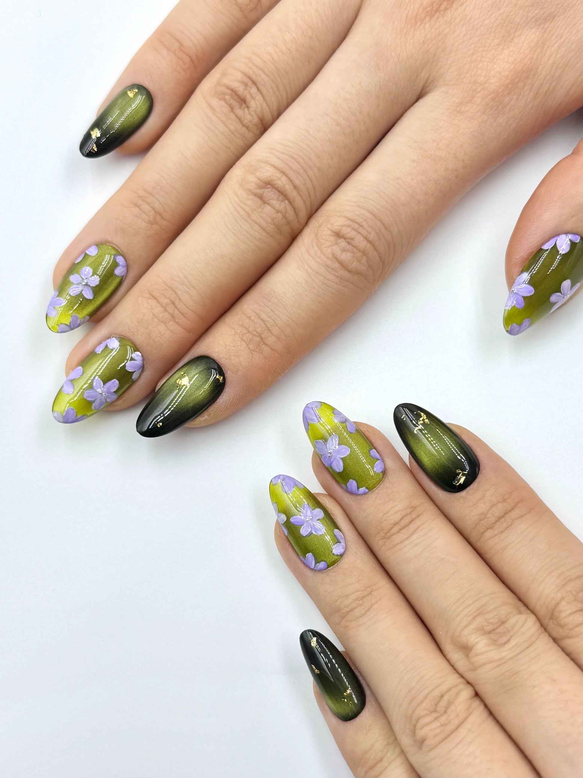 Earthy and quietly enchanting, Forest Trail features a luminous moss green cat-eye base that shifts gently with the light, like sunlight filtering through tall forest trees. Delicate handpainted lilac blossoms bloom softly across the surface, adding a subtle touch of woodland charm.