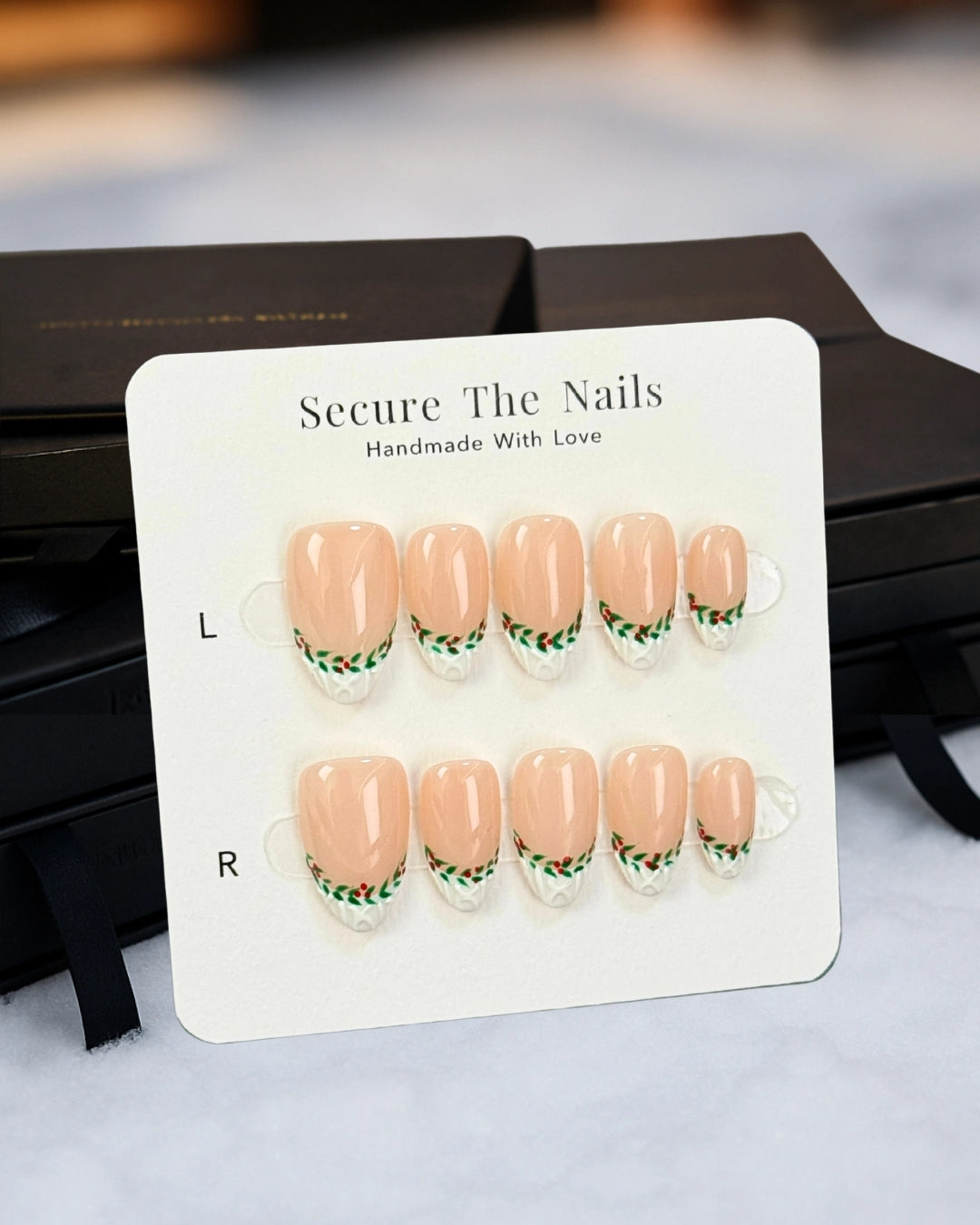 The soft pink nude base keeps it elegant and wearable, while the subtle details make it stand out as something truly special — classy, refined, and full of warm holiday joy.