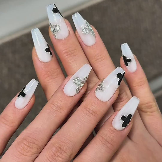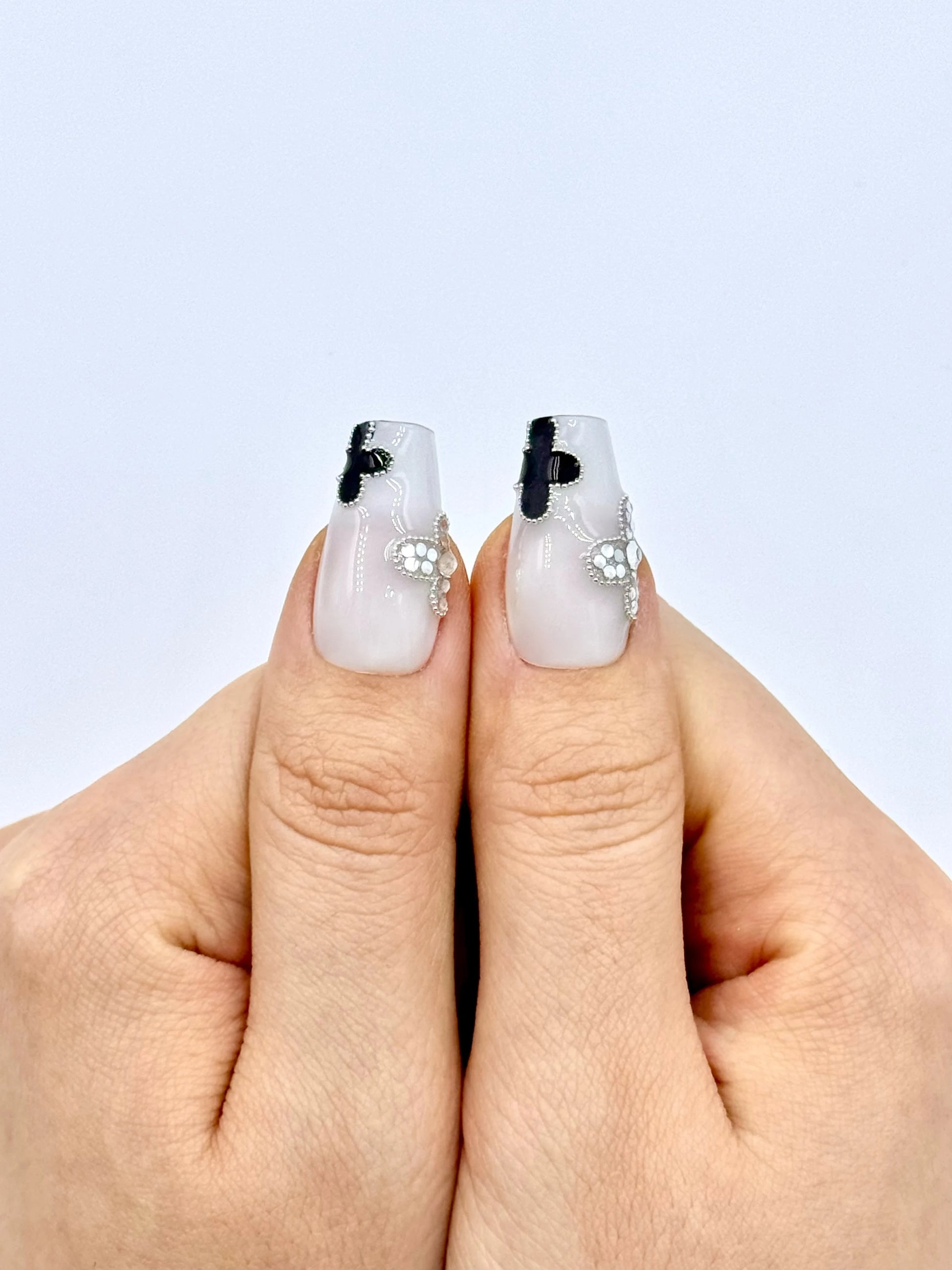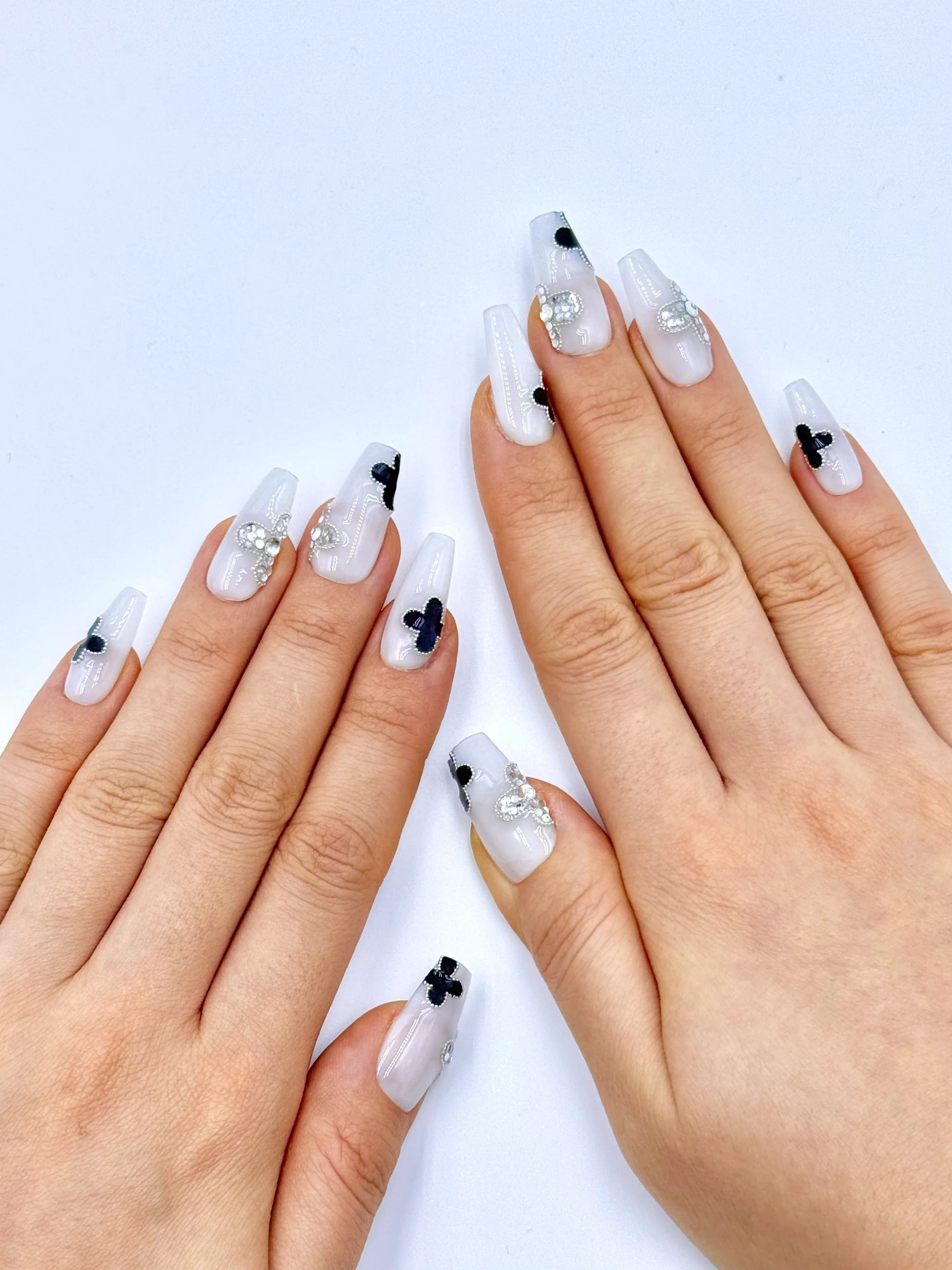 Une base blanche laiteuse douce crée la toile de fond parfaite pour ce design inspiré de la haute joaillerie. Onyx Clover présente de délicats charmes de trèfle faits à la main, ornés de détails scintillants, conférant à l'ensemble une élégance raffinée et précieuse.