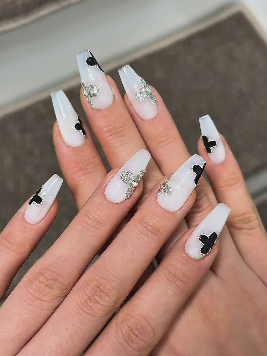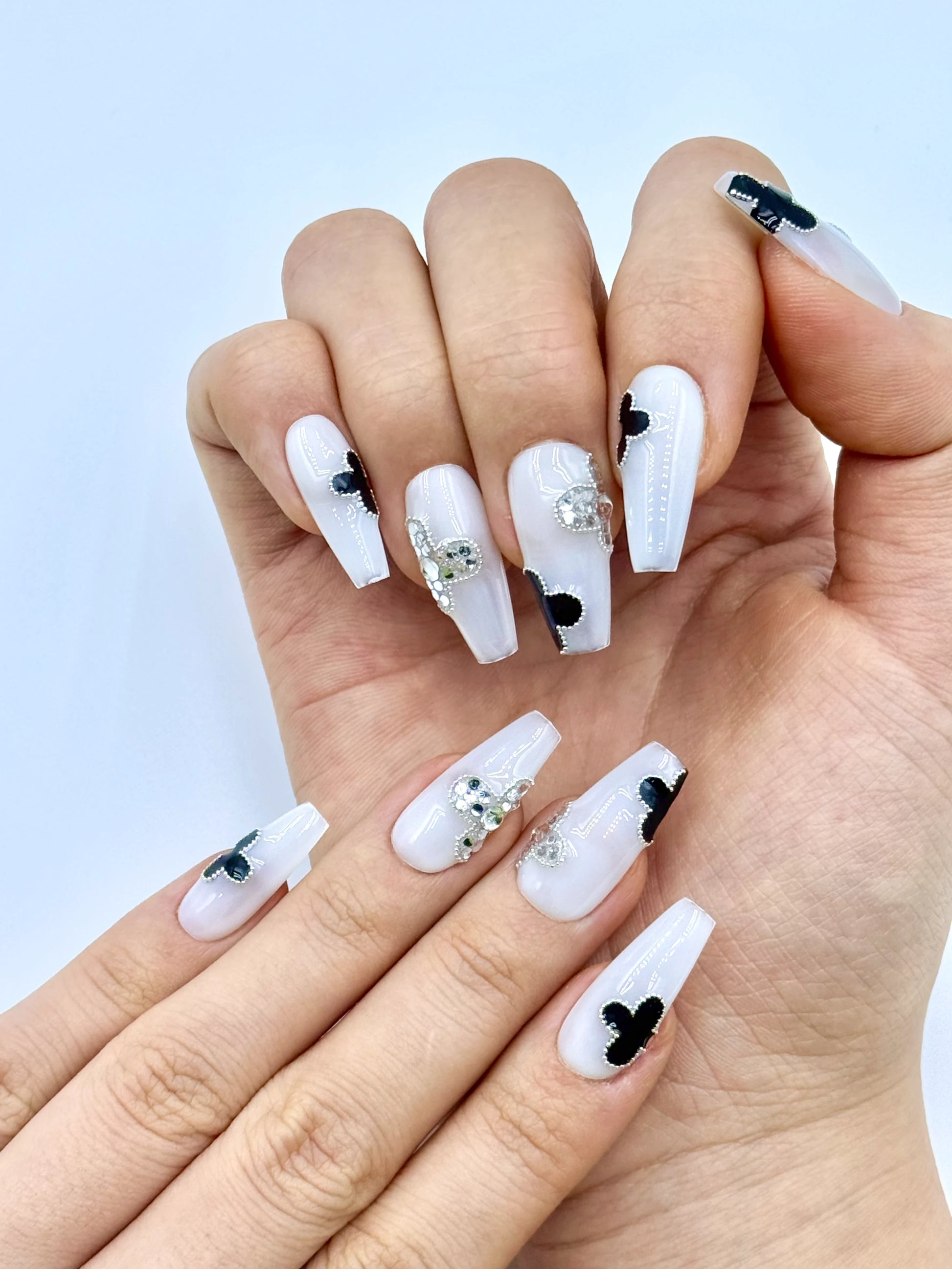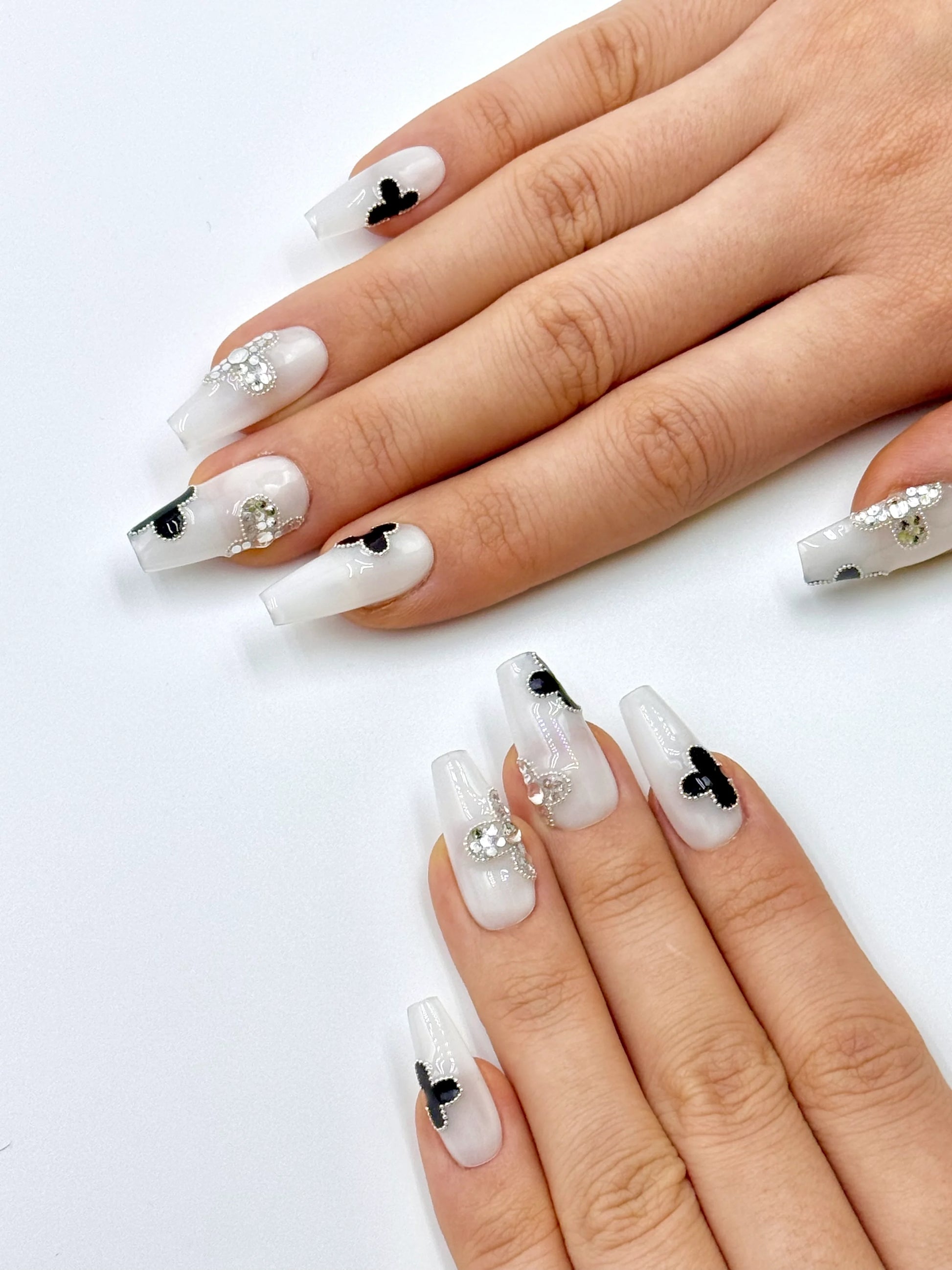 Une base blanche laiteuse douce crée la toile de fond parfaite pour ce design inspiré de la haute joaillerie. Onyx Clover présente de délicats charmes de trèfle faits à la main, ornés de détails scintillants, conférant à l'ensemble une élégance raffinée et précieuse.