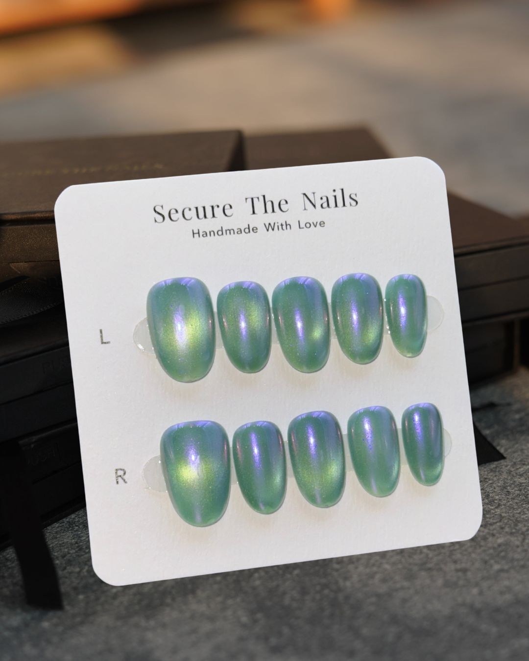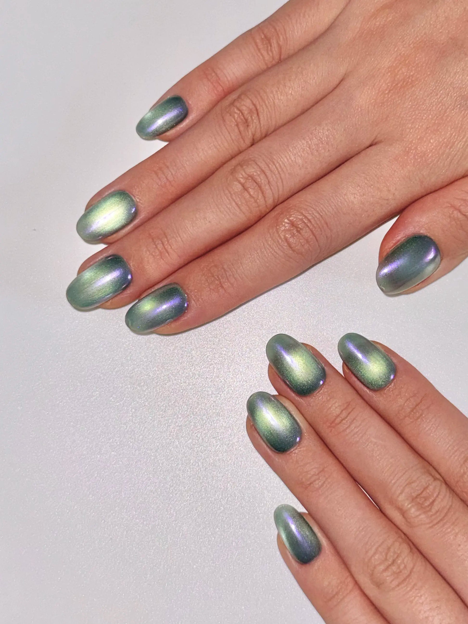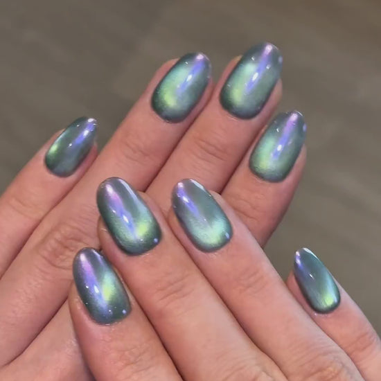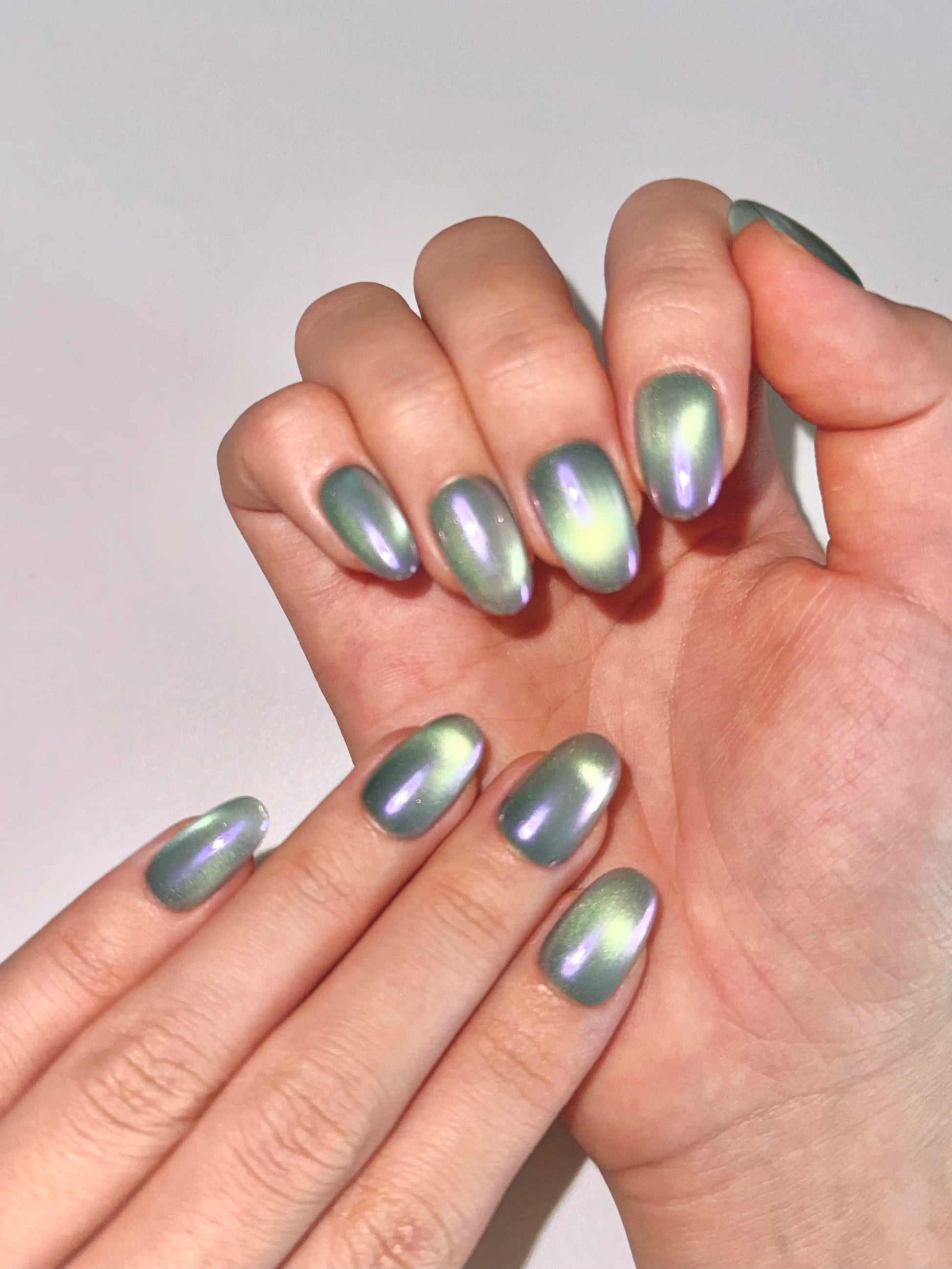 A soft, iridescent glow inspired by the Northern Lights. This design features a translucent sage green cat-eye base layered with shifting green, pink and purple hues that catch the light from every angle.