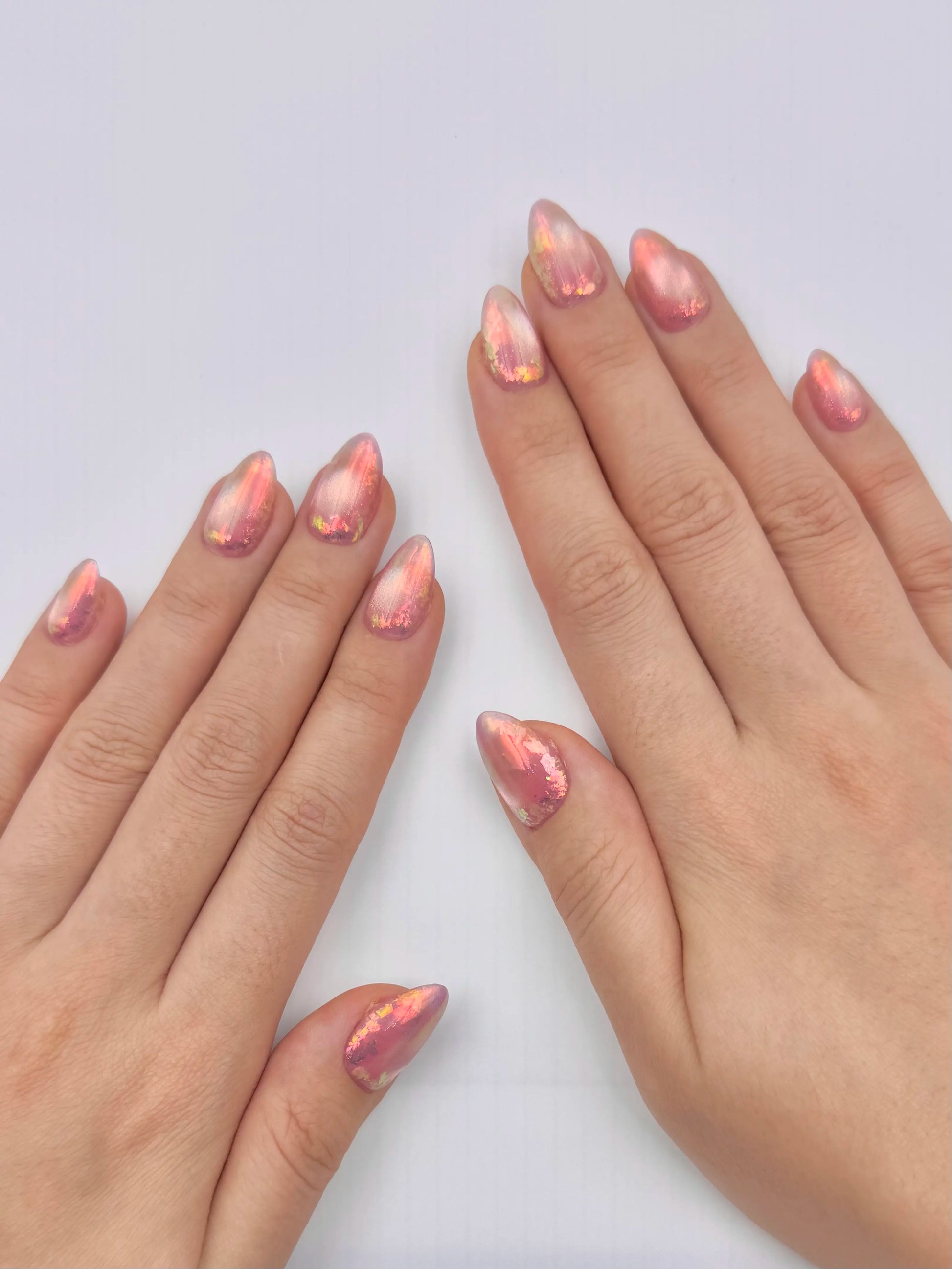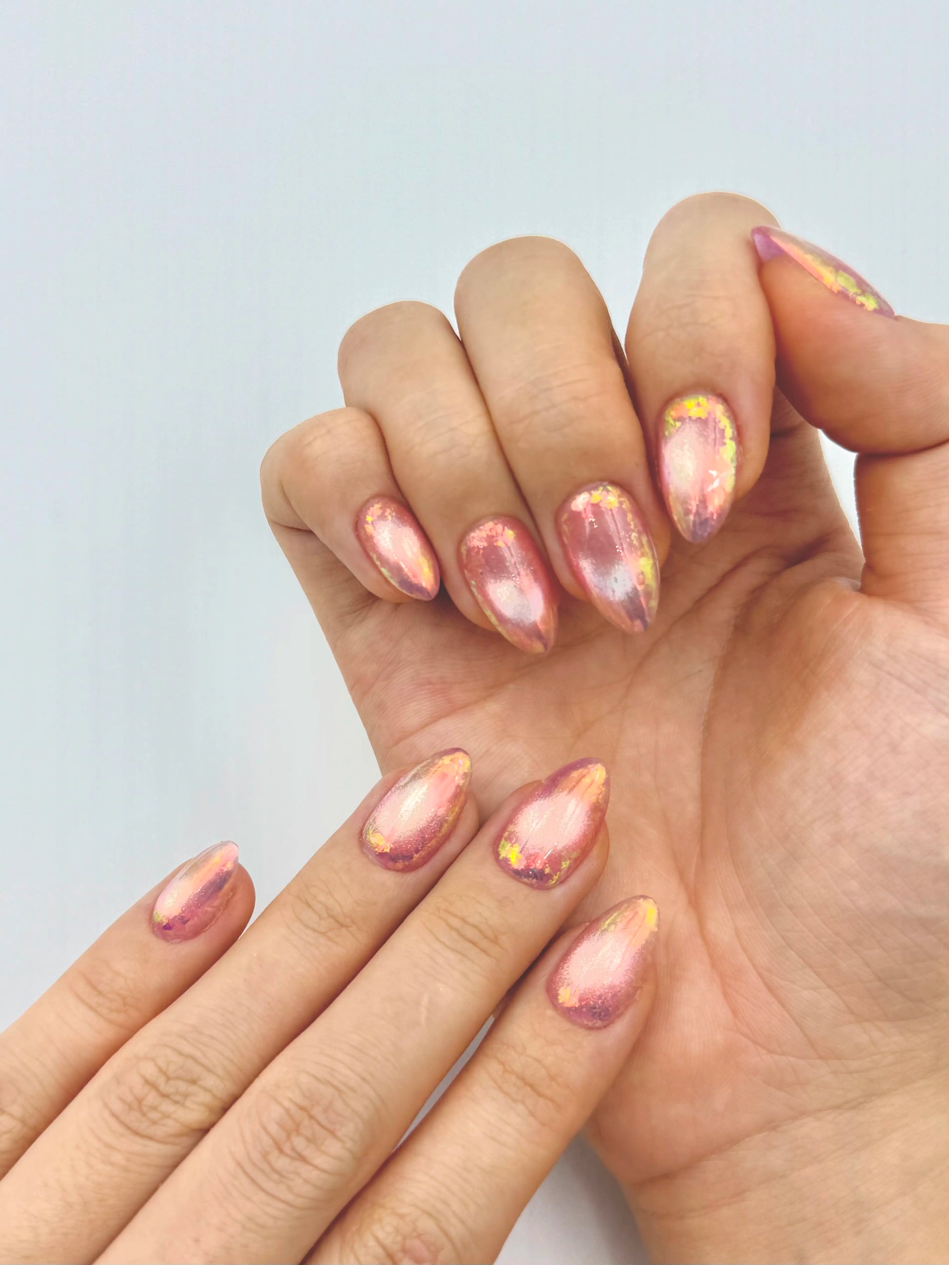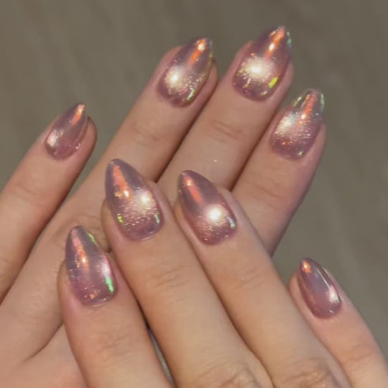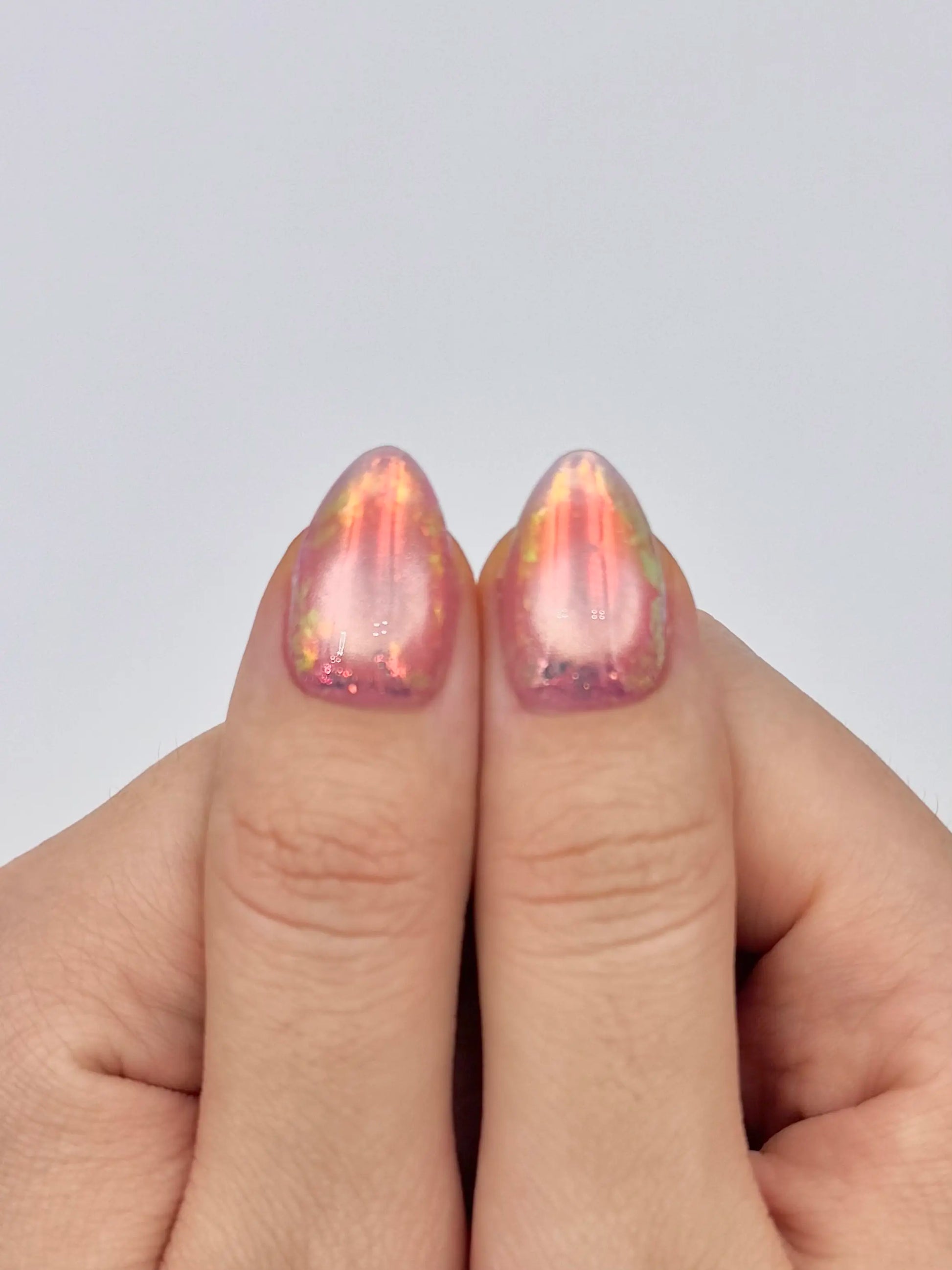 Blush Mirage features a luminous pink cat-eye base kissed with a rose gold chrome sheen, shifting beautifully under the light. Scattered iridescent yellow green foil flakes add a subtle, enchanting sparkle — like sunlight dancing through a warm haze.