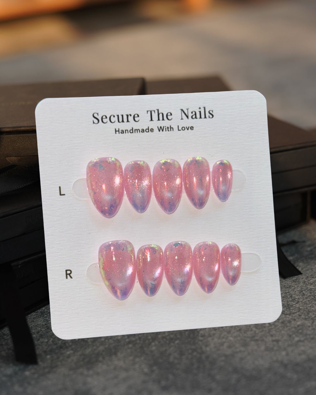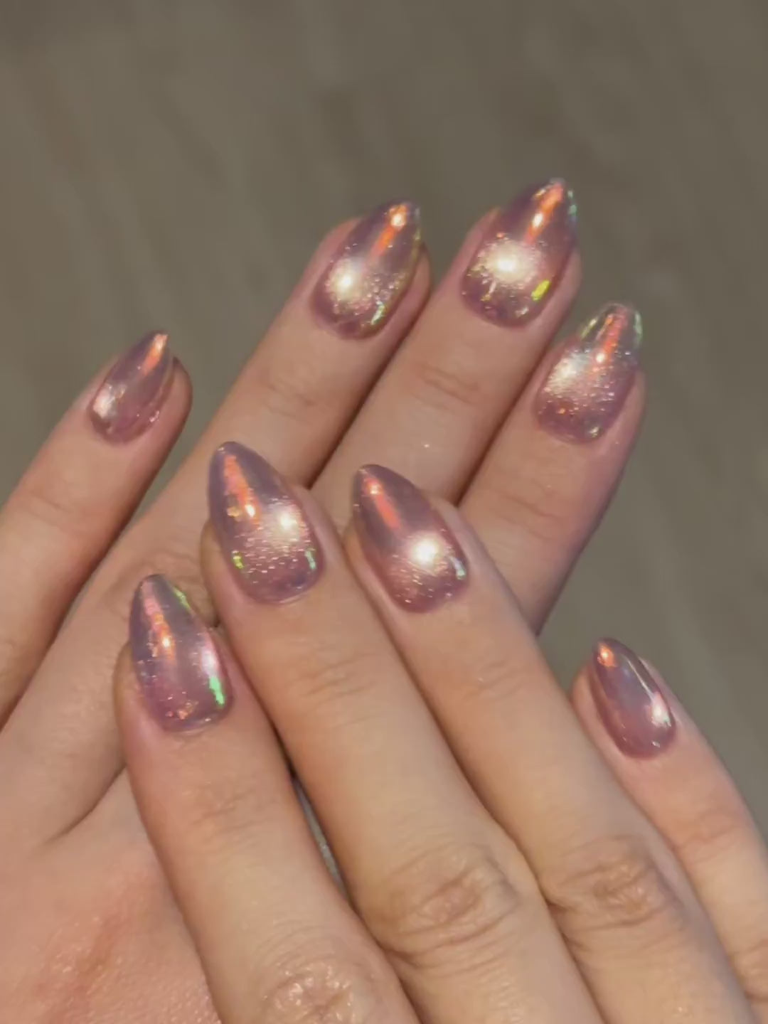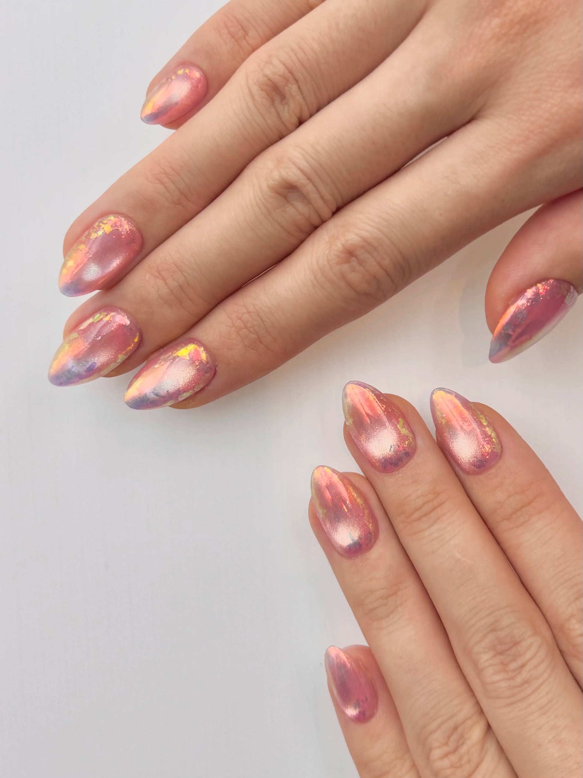 Blush Mirage features a luminous pink cat-eye base kissed with a rose gold chrome sheen, shifting beautifully under the light. Scattered iridescent yellow green foil flakes add a subtle, enchanting sparkle — like sunlight dancing through a warm haze.