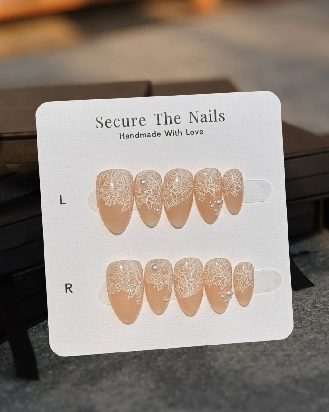 N.U.D.E features a warm beige nude base adorned with delicate white lace detailing, draped like a sheer veil across each nail. Subtle pearl accents add a touch of quiet romance, creating a look that feels soft, feminine, and intimate.