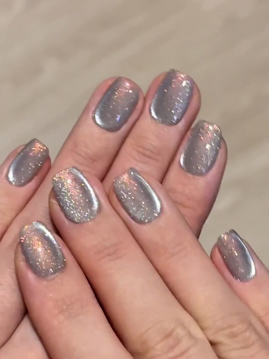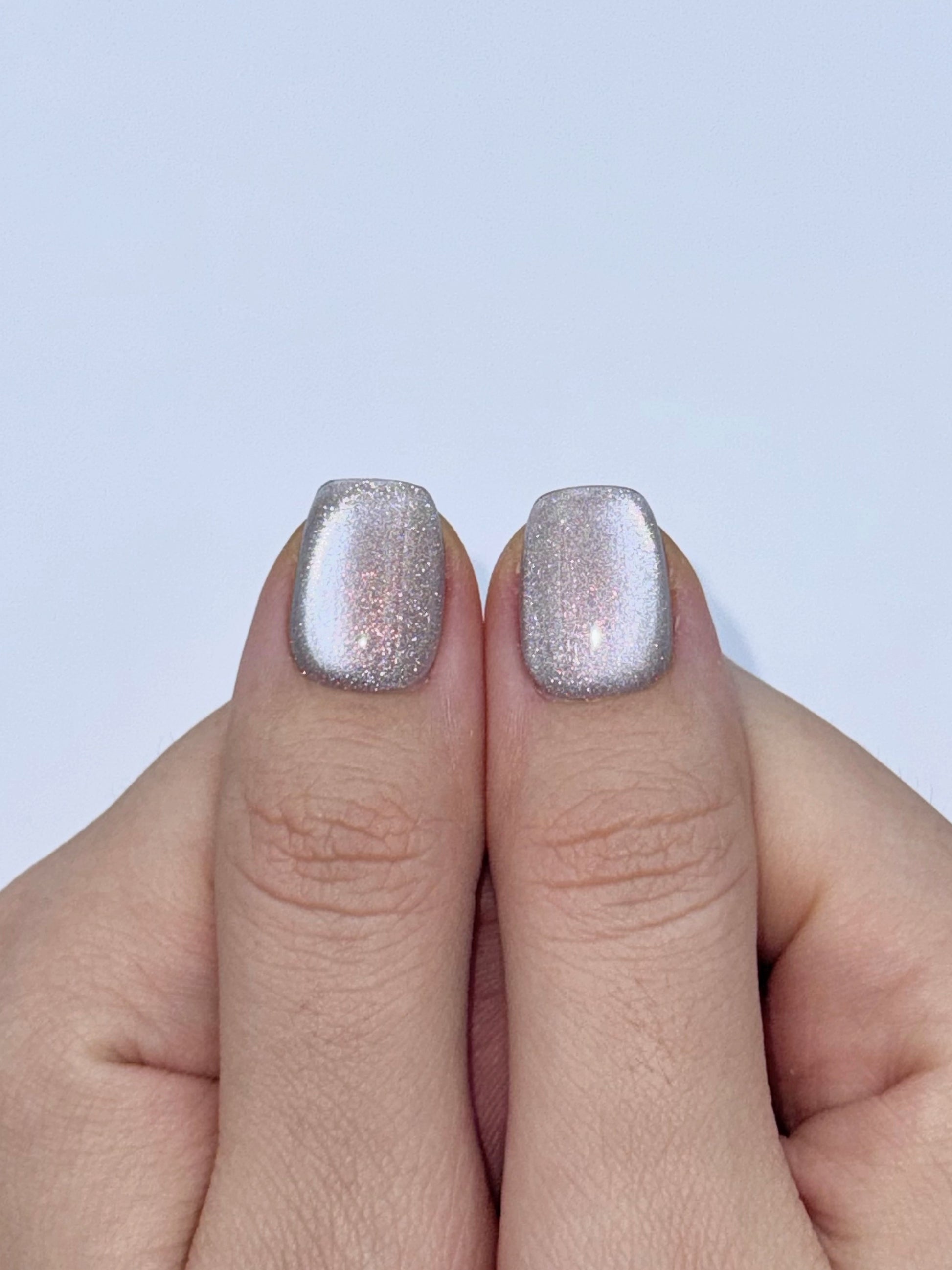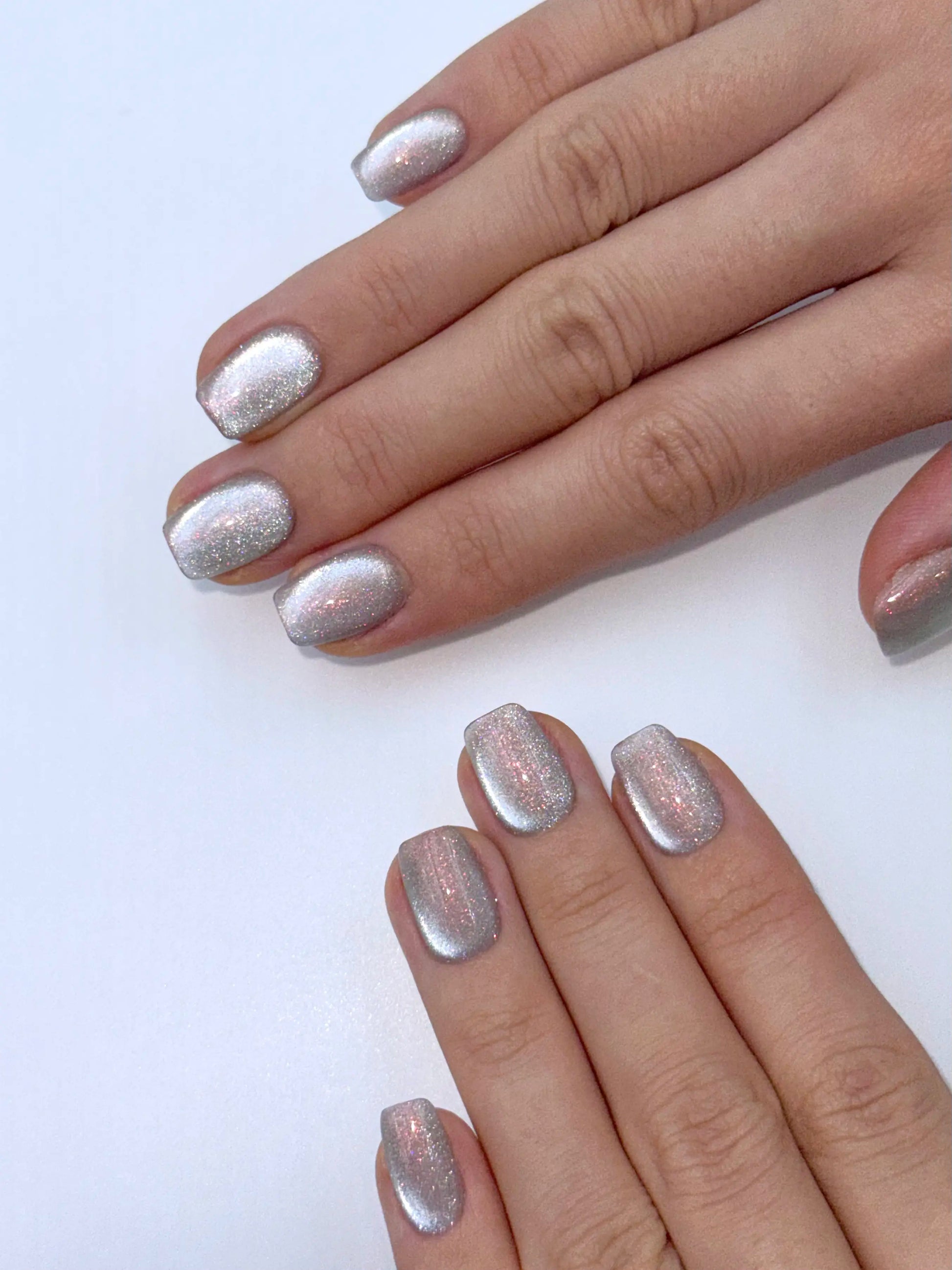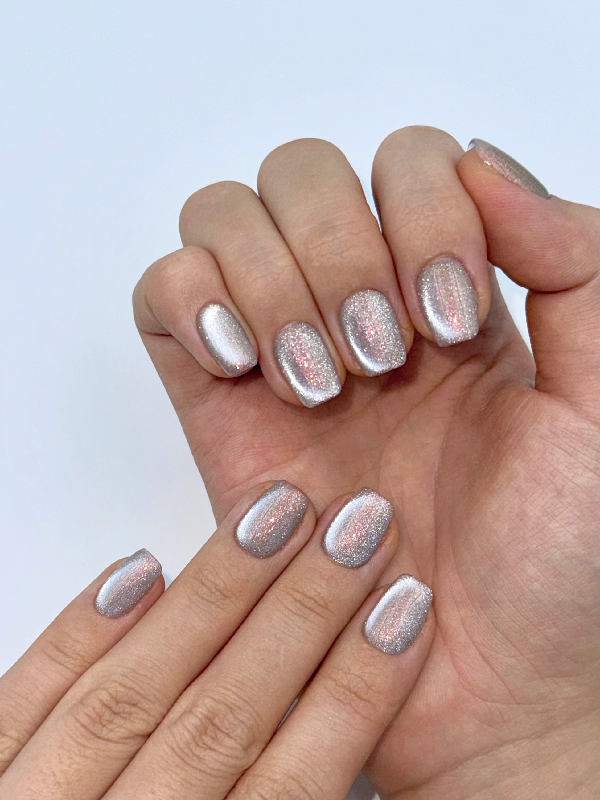 A dreamy blend of everyday elegance and subtle glamour. Stardust features a silky silver cat-eye base kissed with fine rose gold sparkles — delicate, dimensional, and effortlessly striking.